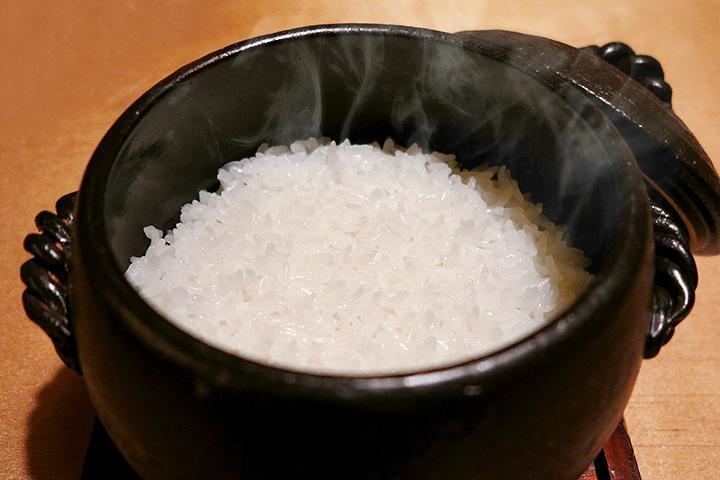 全国各地から厳選した5種類の銘柄米の中からお客さまがお選びになられたお米を土鍋で1合ずつ炊き上げ、ご提供しています。